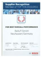 El acto oficial de reconocimiento tuvo lugar en Crailsheim con la asistencia de Michael Unger, Director Gerente de Balluff. El premio fue otorgado a los proveedores más sobresalientes por su aportación decisiva al éxito de la división Packaging Technology de Bosch. La división de envasado de Bosch ha justificado este premio por el excelente rendimiento logrado en la fabricación y el suministro de productos o servicios. Se ha evaluado a un millar de compañías aproximadamente y entre ellas se ha seleccionado a las diez primeras. Un criterio fundamental para la selección ha sido la flexibilidad. Balluff destacó por su exitosa implementación de numerosos proyectos a medida, de ahí que se diferenciara de sus competidores. |