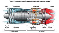 Las aleaciones se seleccionan para satisfacer las condiciones de servicio específicas de temperatura, así como los requisitos de todos los componentes a unir. Los ejemplos incluyen aleaciones utilizadas en las nuevas secciones calientes de la turbina, soldadura cerámica de nitruro de silicio y las nuevas piezas de súper aleación del motor. Véase la Tabla 1 para un resumen de las aleaciones de de una soldadura mas fuerte disponibles, que muestra la parte del motor que se utiliza en el componente / material base. La mayoría de los aviones modernos utilizan motores turbofan, debido a su alto empuje y la eficiencia de combustible. Un turboventilador tiene algo de su empuje desde el núcleo y algo del ventilador. El aire entrante es capturado en la entrada del motor. Parte del aire entrante pasa a través del ventilador y continúa en el compresor de núcleo y luego al quemador, donde se mezcla con el combustible y se produce la combustión. El gas de escape caliente pasa a través del núcleo y las turbinas del ventilador y luego fuera de la boquilla. El resto del aire entrante pasa a través del ventilador y pasa por el motor, similar al aire que pasa a través de una propela. El aire que pasa a través del ventilador tiene una velocidad ligeramente mayor. [1] La Figura 1 es un diagrama de un motor de turboventilador típico, que muestra los lugares más comunes para el uso de aleaciones, incluyendo los utilizados para "zona fría" del motor (aire de entrada y compresor) su "sección caliente" (turbina y cámara de combustión). El sitio de metales Morgan Technical Ceramics’s Wesgo en Hayward, CA, produce más de 15 composiciones de aleación de una soldadura más fuerte para uso en la sección del compresor. Nioro ® se utiliza en Inconel X750 o 718 para obtener una solución a la temperatura de recocido sin exceso de crecimiento de grano que se produce a partir de aleaciones basadas en níquel. Nioro ® es una aleación de alta pureza del oro / níquel para una soldadura fuerte al vacío. Las aleaciones de níquel de una soldadura más fuerte se utilizan en el compresor y la sección de soldadura de la turbina. En su forma de aluminio, puede ser utilizada para una soldadura fuerte en forma de panal y tiras de metal para sellado En la sección de estator de un motor de turboventilador, el estator tira del aire frío y no pasa por el motor, creando el empuje extra. El estator tiene también un papel en la reducción de la turbulencia, para que el cabeceo y balanceo del aire se reduzca al mínimo. En los sistemas de turboventilador de combustible, níquel oro y níquel oro platino se utilizan para una soldadura más fuerte en los tubos del sistema de combustión y boquillas. La boquilla de combustible, encuentra donde la primera y segunda etapa de combustión tienen lugar, presenta una cantidad considerable de calor. Es necesaria una ductilidad en las juntas con una soldadura más fuerte para ayudar con la expansión y vibración en la sección de combustión. Las aleaciones de oro y platino con una soldadura mas fuerte también presentan un contraste superior en la unión soldada, lo que permite el uso de la tecnología de rayos X para comprobar la integridad de la unión con una soldadura más fuerte. Además, estas aleaciones muestran una muy buena resistencia a la corrosión. Esta es una de las áreas donde los fabricantes de motores han expresado un enorme interés en los materiales que puedan soportar temperaturas muy extremas, donde supe aleaciones convencionales fallan.